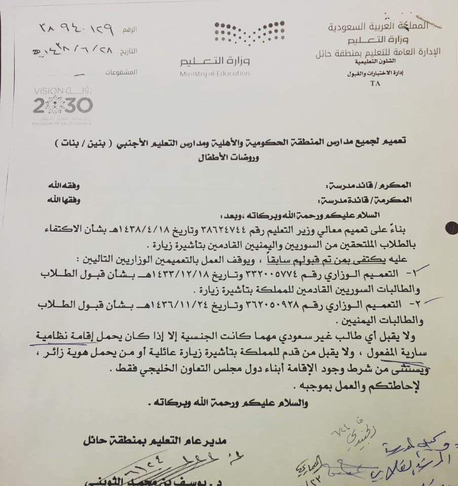 وكالة تعليق الدراسة On Twitter قرار صادر من وزير التعليم بعدم قبول الطلاب بالصف الاول ممن لديهم تاشيرة زيارة من السوريين واليمنيين وغيرهم مهما كانت الجنسية وزارة التعليم Https T Co Tajodd4kee