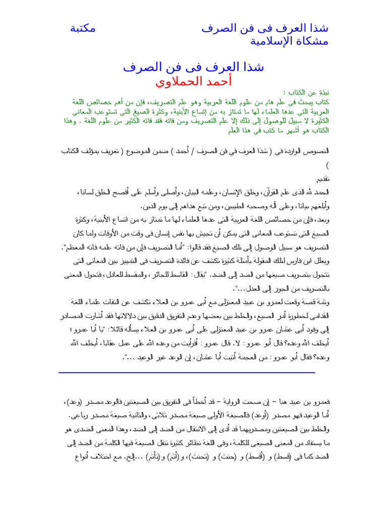 تحميل وقراءة كتاب شذا العرف في فن الصرف تأليف أحمد بن محمد بن أحمد الحملاوى Pdf
