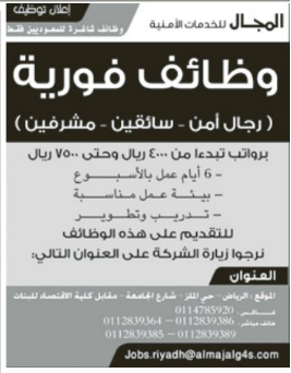 وظائف المجال للخدمات الامنية حراس امن وسائقين ومشرفين رواتب 4000 7500 ريال